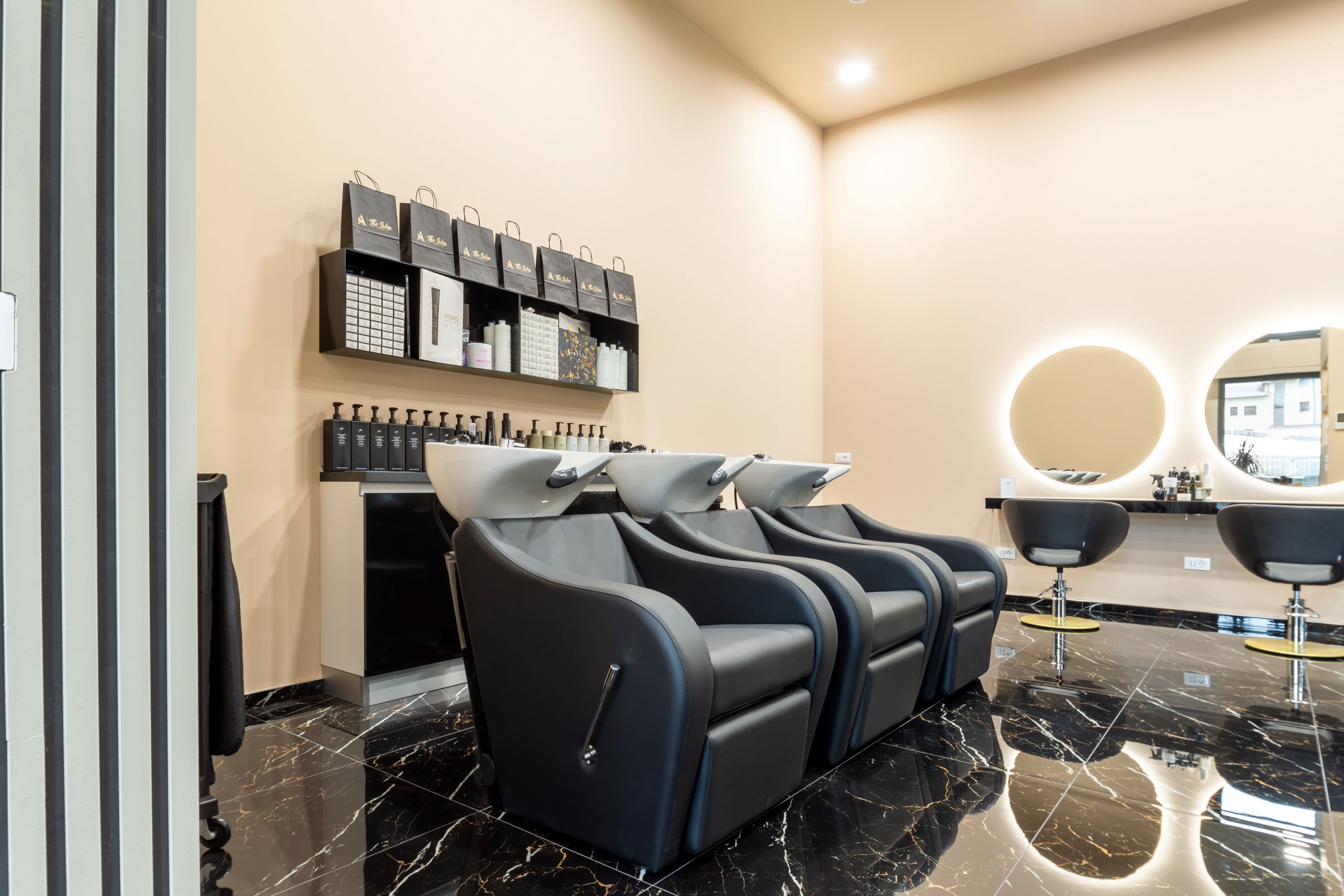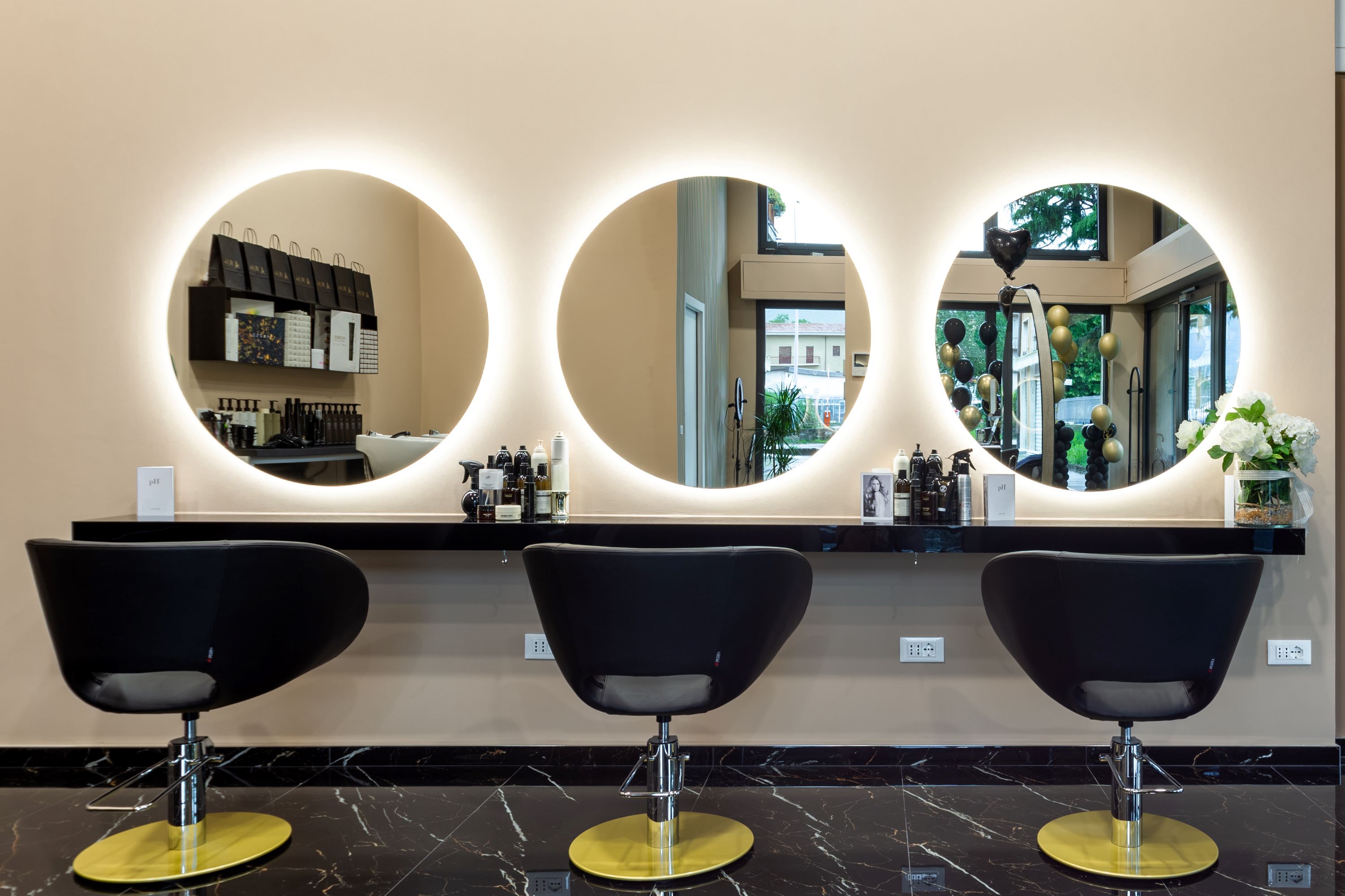Il risultato? Un salone vistoso, accattivante ed elegante, femminile e unico. Gli specchi tondi danzano con la natura irregolare delle venature, mentre il nero lucido ed opaco si accende con l'oro che caratterizza ogni angolo.